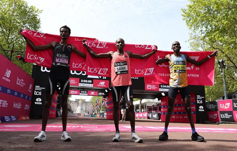Все трое призеров Лондонского марафона этого года в одном забеге побили прошлый мировой рекорд, установленный в 2023 году. Слева направо: Йомиф Кеджелча, Себастян Саве, Джейкоб Киплимо.